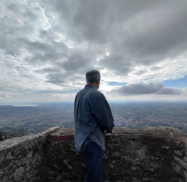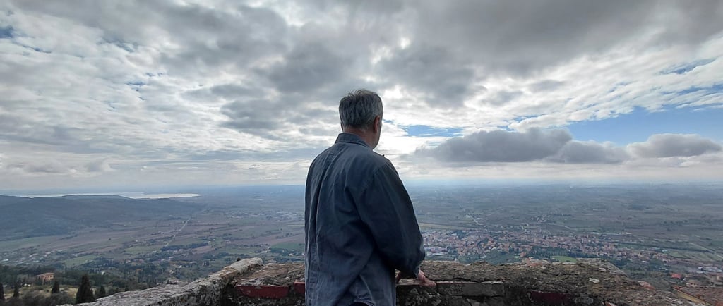 So many memorable moments watching from above. The day before Italy went into its first hard lockdown in March 2020, we knew we’d be stuck inside for a while. As a marker of what was to come, we headed for a walk close to the ruins of a medieval fortress with sweeping views of Chianti below. We climbed around massive stones that had broken loose from the structure’s thick walls and wondered who’d stood guard there once centuries before the hills were covered with vineyards. We knew what was coming the day after, us, and another couple who lived a few valleys away. We pretended we were a rock band in a photo session for our album cover, calling ourselves The Sentinels. In anticipation of that feeling of the complete unknown of what lockdown would feel like and that out in the middle of nature offered sanctuary,“Run for the Hills” became our fictitious album’s title. For that moment, the views, all the make-believe and hi jinx with good friends, lightened the spirit.